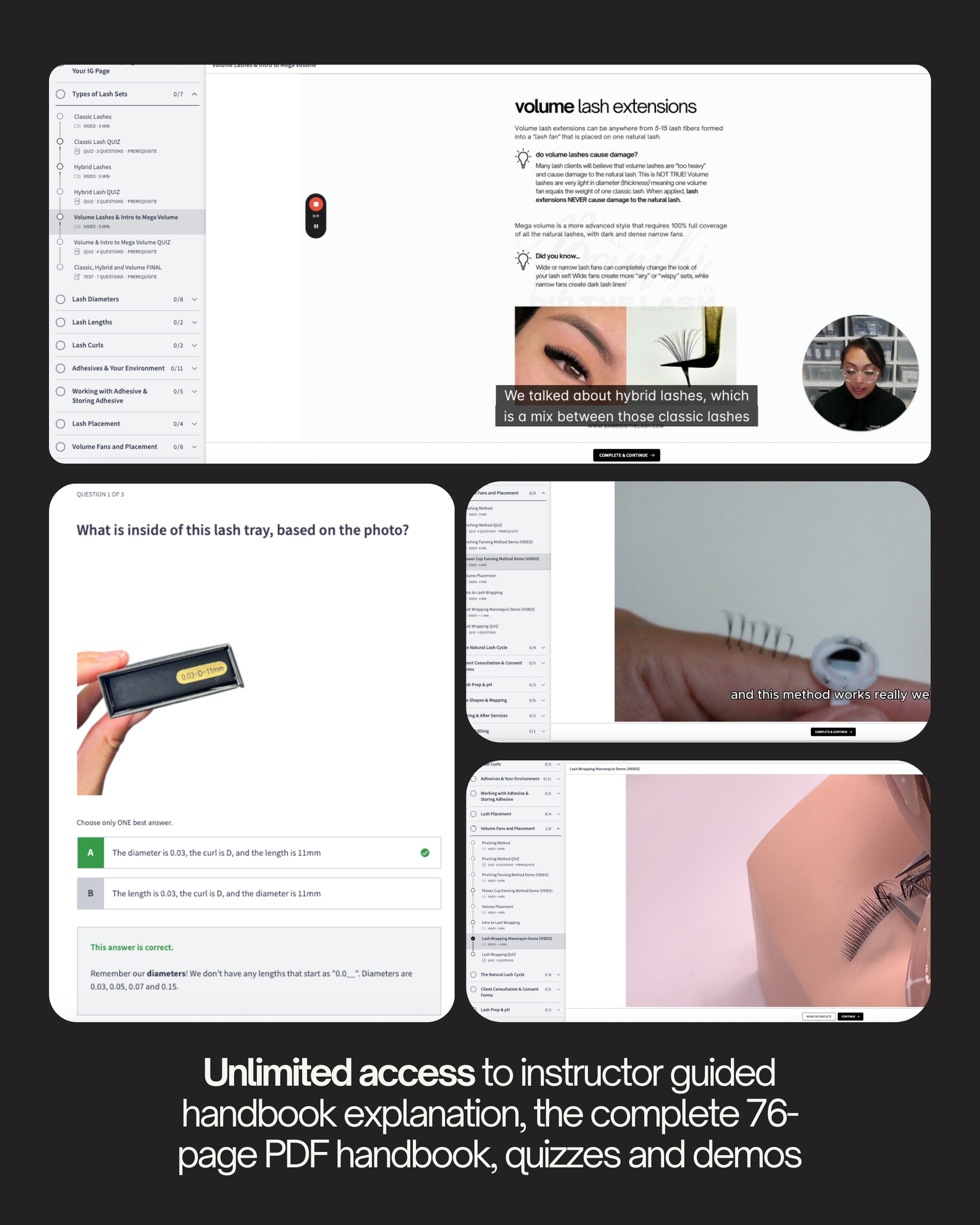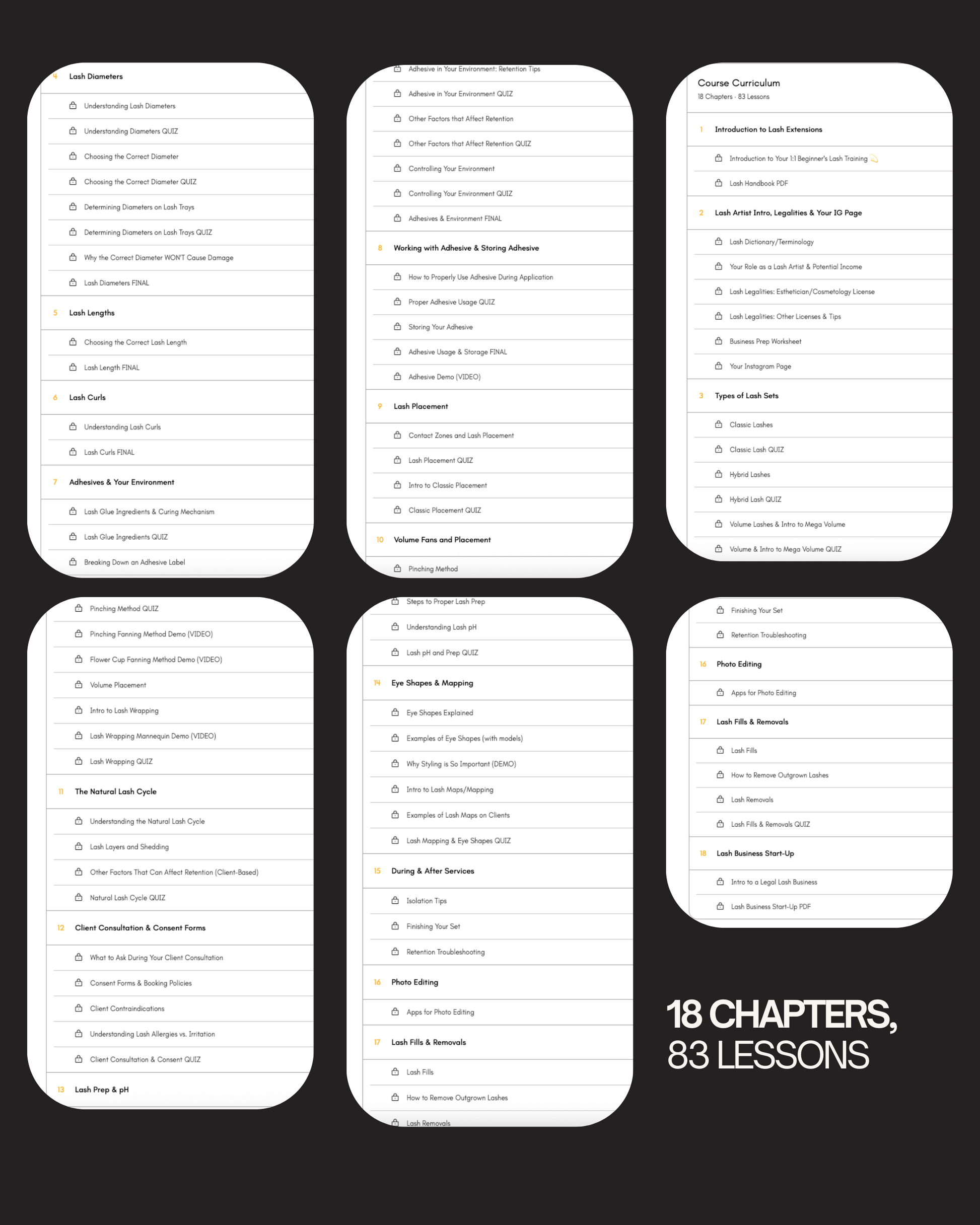 18 chapters and 83 lessons covering lash theory, techniques, styling, and best business practices—structured like a high-flow audiobook with English captions to keep you engaged and learning at every step -