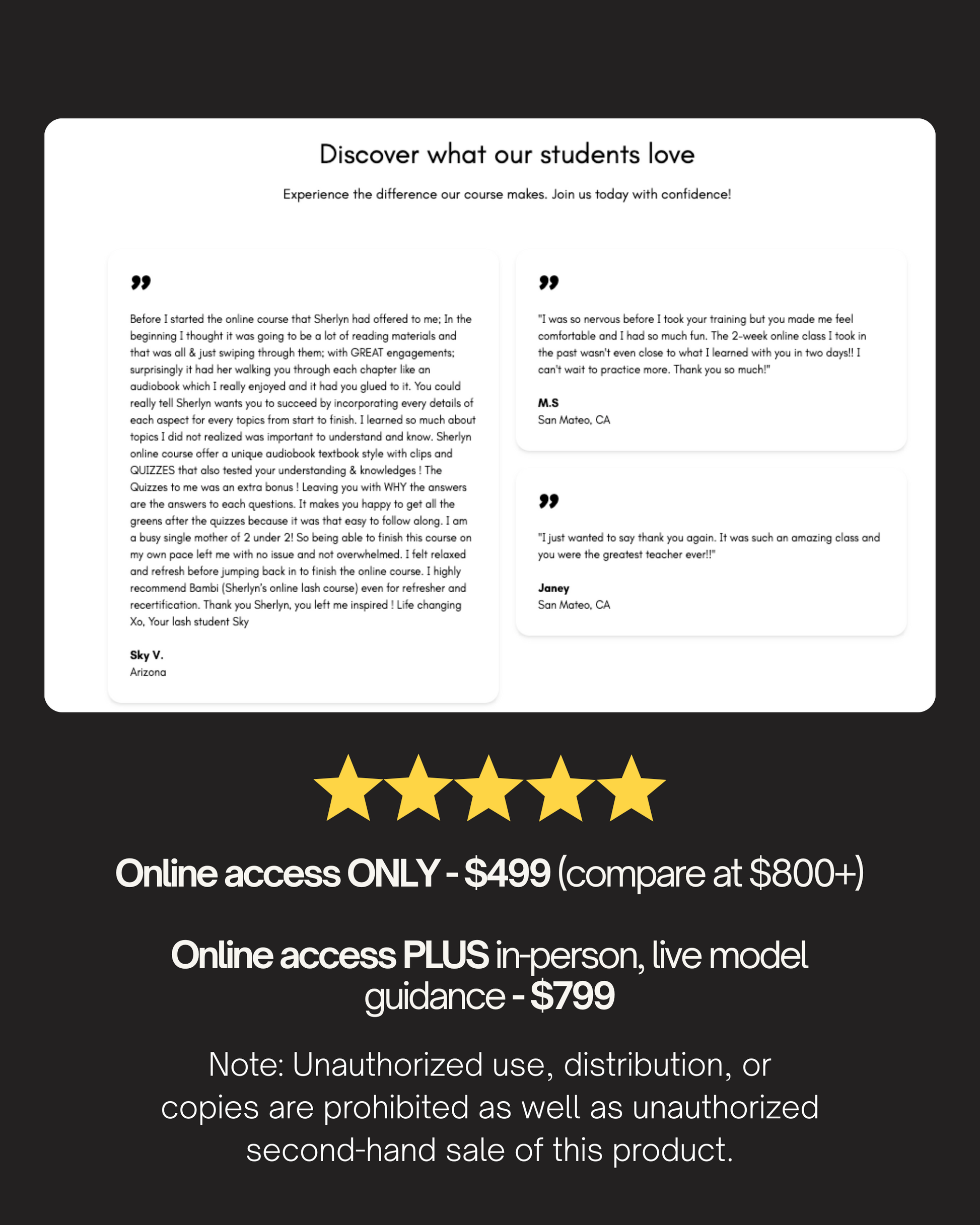 Live model sessions require students to travel to San Mateo, California with their own model and products, where a model set will be overlooked and guided by Sherlyn, owner of Bambi Did the Lash LLC. Please note these sessions will be booked in 4hr sessions, and will require booking that time via a link sent after purchase.